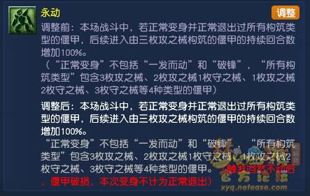 岿然不动调整为免疫致死伤害,点出锻铁(3-3)则不再受3守形态限制也能触发该效果。