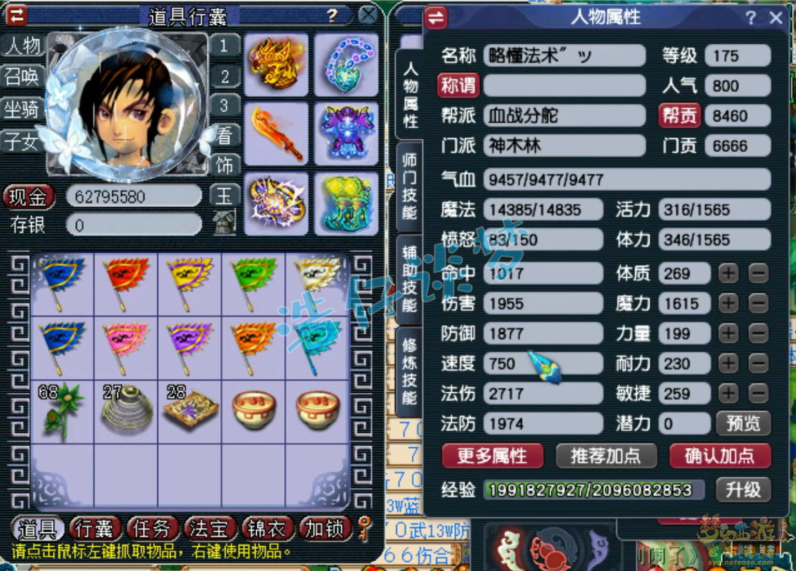 175级神木林打符之后的面板属性,在拥有2717法伤的同时,还有750的速度,各种难度任务都够用,尤其是可以用来竞速。