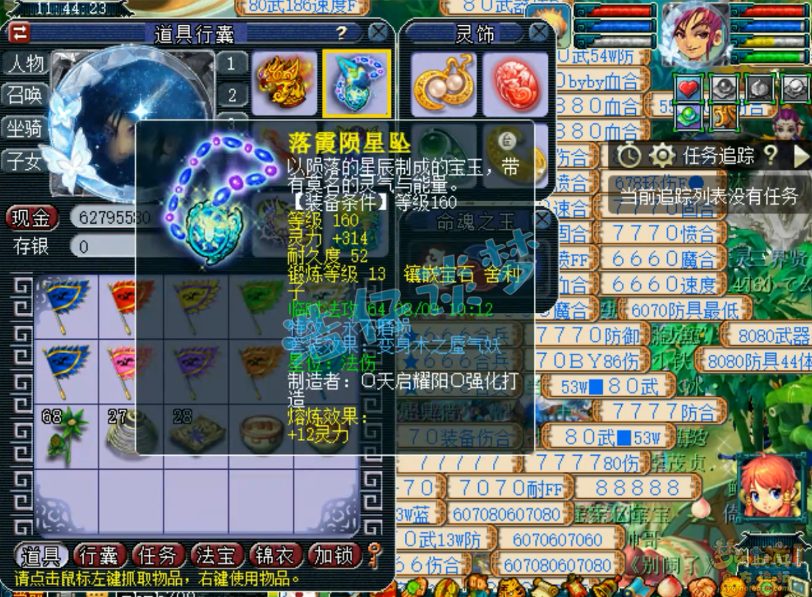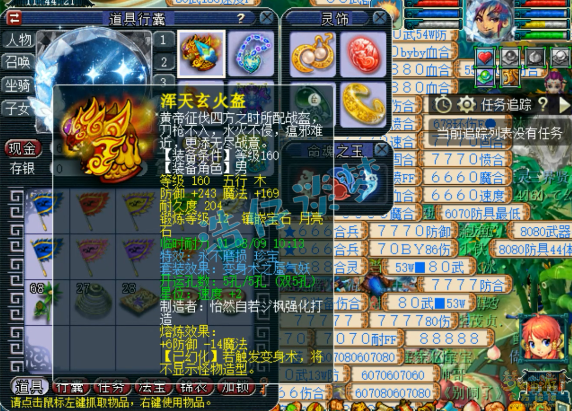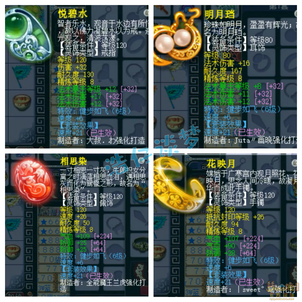 戒指和耳饰下排都是双法伤一法暴,佩饰下排双防御一气血,手镯下排双气血一防御,全部打了8锻星辉石,特效都是6级健步如飞。打健步如飞就是用来刷任务了,PK会选择163。
