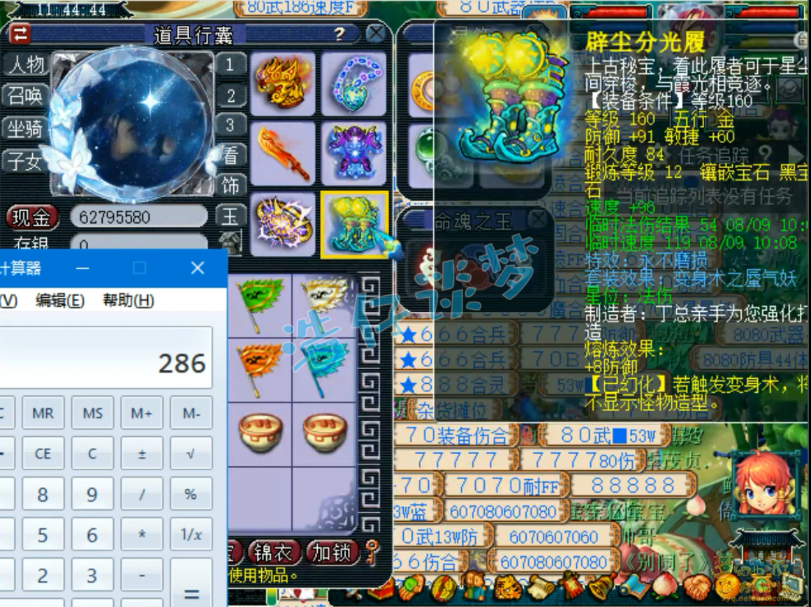160级不磨蜃气妖套鞋子,打了12锻黑宝石。