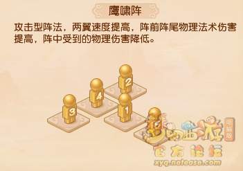 :两翼速度提高,阵前阵尾物理法术伤害提高,阵中受到的物理伤害降低。与雷绝阵、龙飞阵相比,鹰啸阵提供的速度加成更快,更有助于封系抢夺出手权;与鸟翔阵相比,鹰啸阵能给输出提供高额的伤害加成。