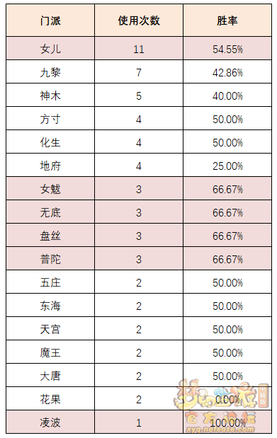 胜率方面同样有极大的变化。女儿村以最高的使用率拿下54.55%的胜率,充分体现了自身的门派强度,用数据宣告了封系一姐的回归;九黎城的胜率跌落50%,仅有42.86%,在经过门派调整后九黎城的强度有了大幅降低,在PK中的表现也没有了过去的统治力;女魃墓、无底洞、普陀山、盘丝洞这4个门派的表现完全一致,以相同的登场率拿下66.66%的胜率,这4个门派在今年一致有不俗的表现,值得继续深入挖掘。