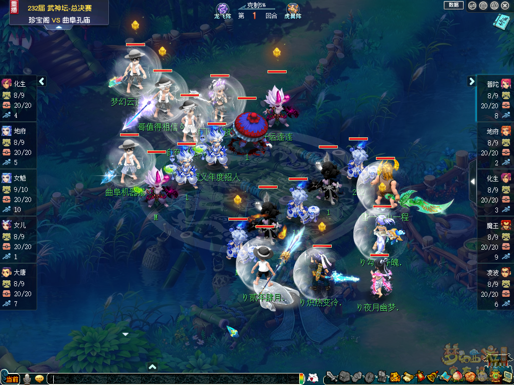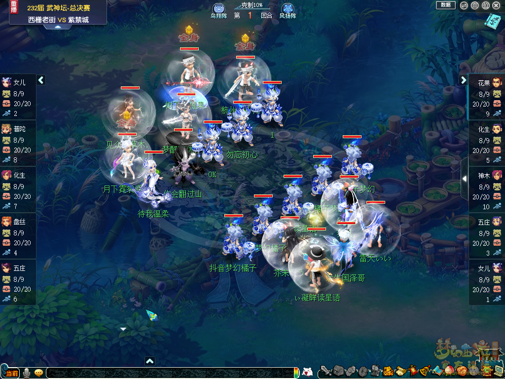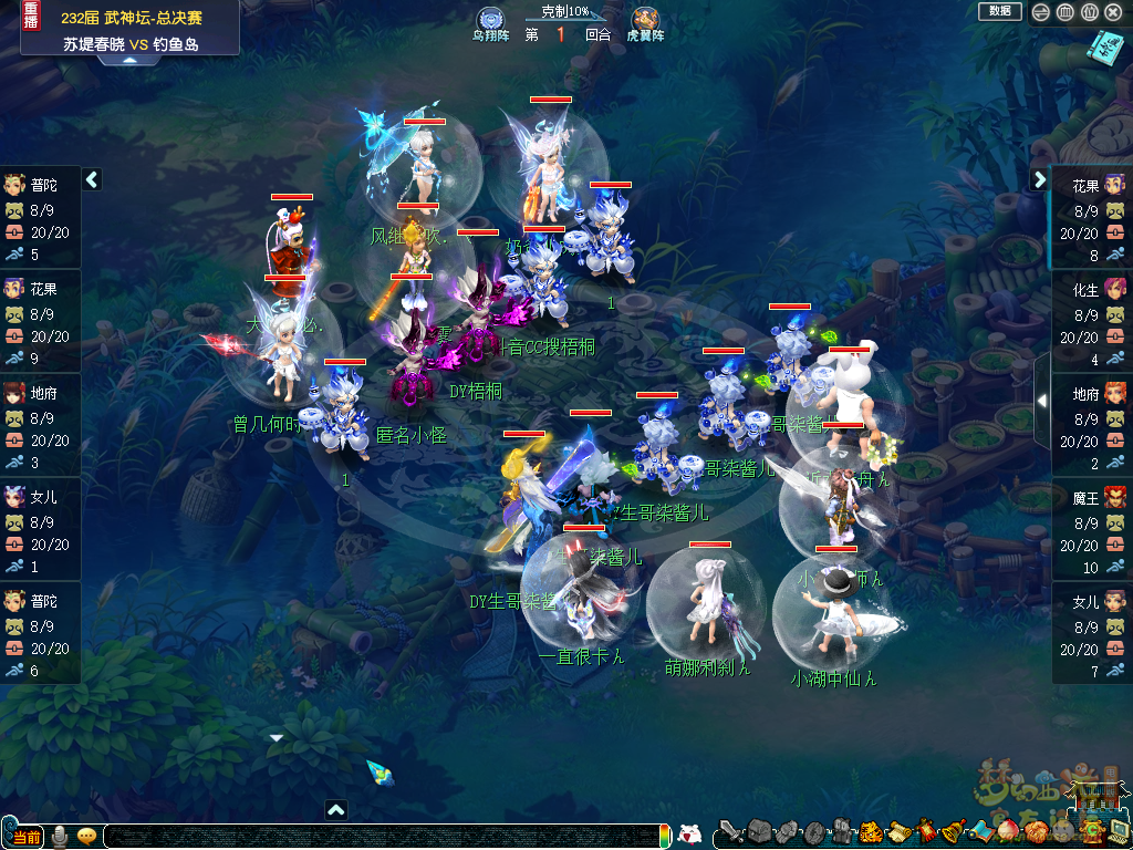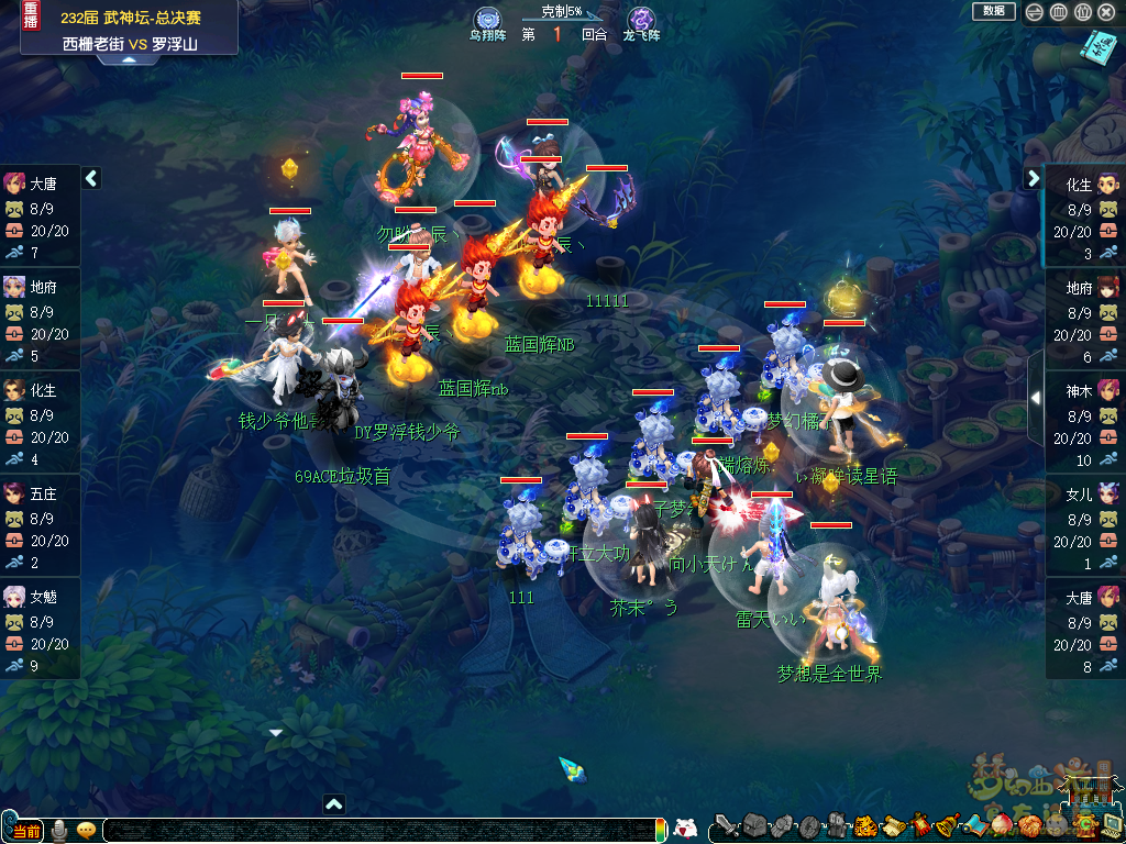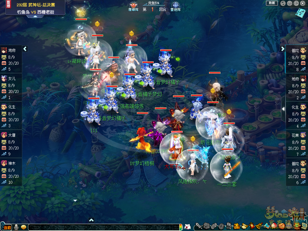 第232届武神坛半决赛,钓鱼岛(观战方)同西栅老街(对战方)相遇,钓鱼岛选用了“双咒师普陀、地府、化生、花果”组成的“保大核”阵容,西栅老街则是选用了“地府、女儿、化生、大唐、神木”组成的“国标点杀”阵容。