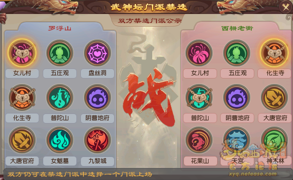 禁选阶段,【西栅老街】禁用了对手的化生寺+女儿村,【罗浮山】禁用了对手的化生寺+普陀山。从禁选界面中可以发现,【西栅老街】这次甚至没有携带九黎城出战,而是选择了大唐官府和花果山作为物理输出。