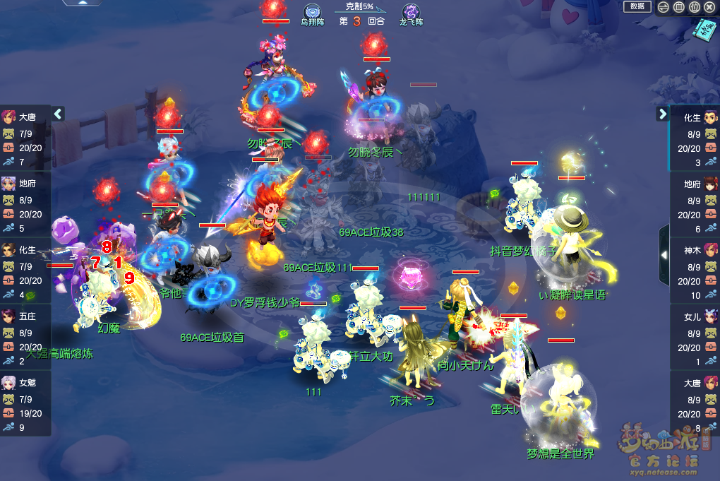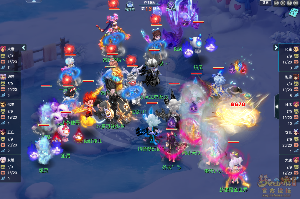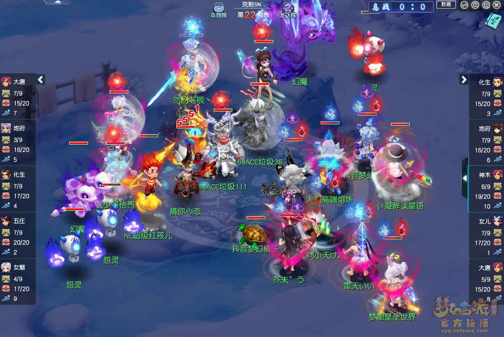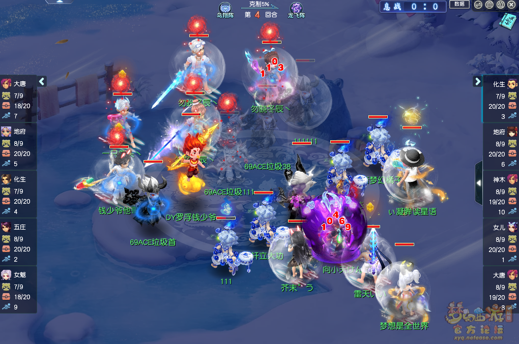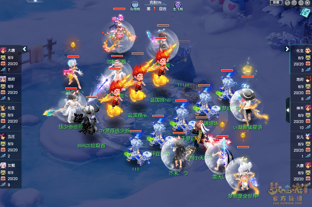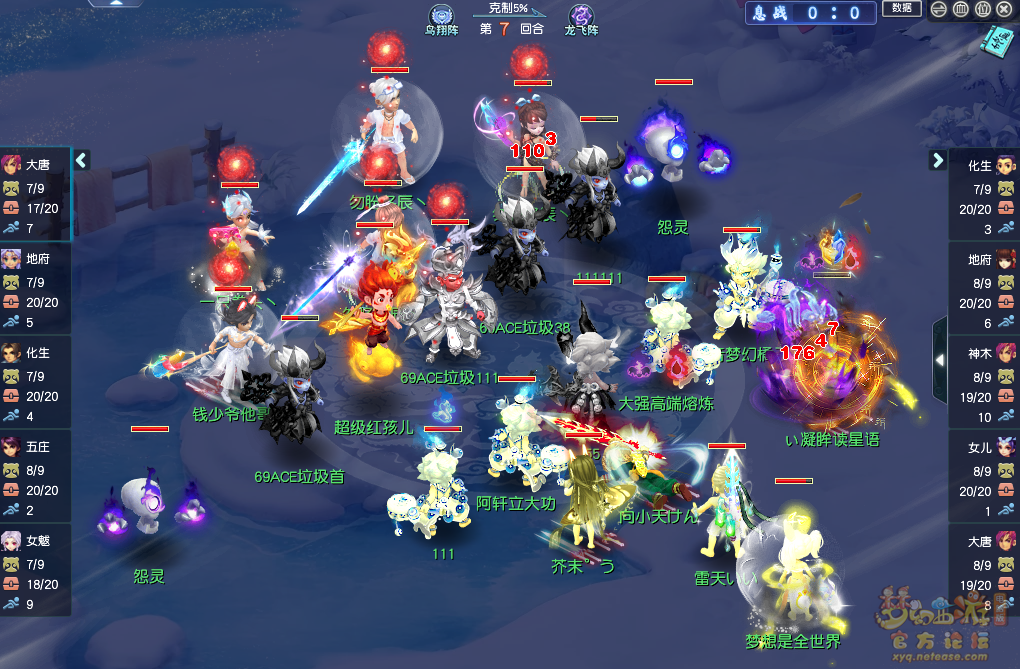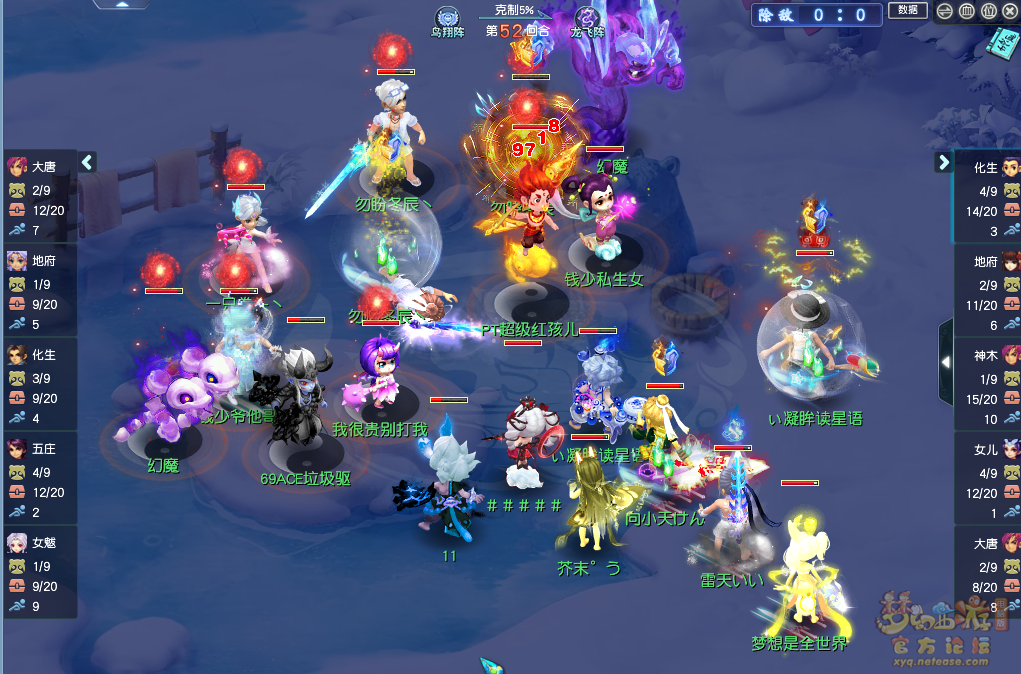 观战方【西栅老街】:女儿村、化生寺、阴曹地府、大唐官府、神木林,国标阵容。