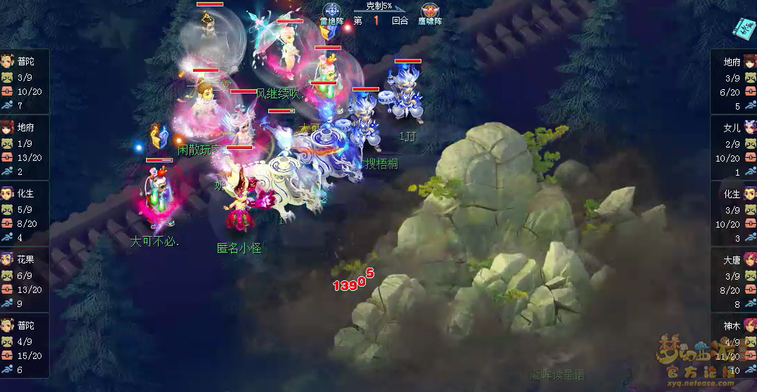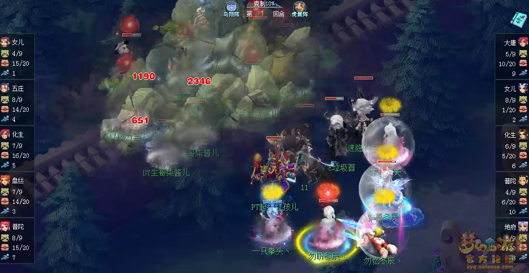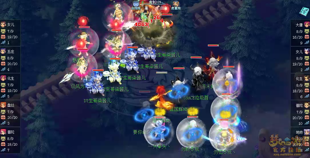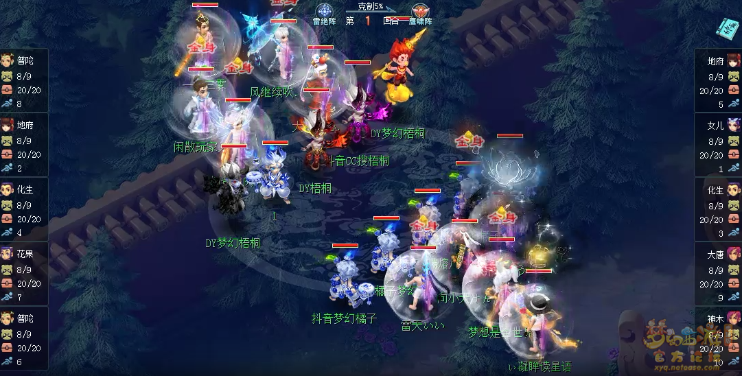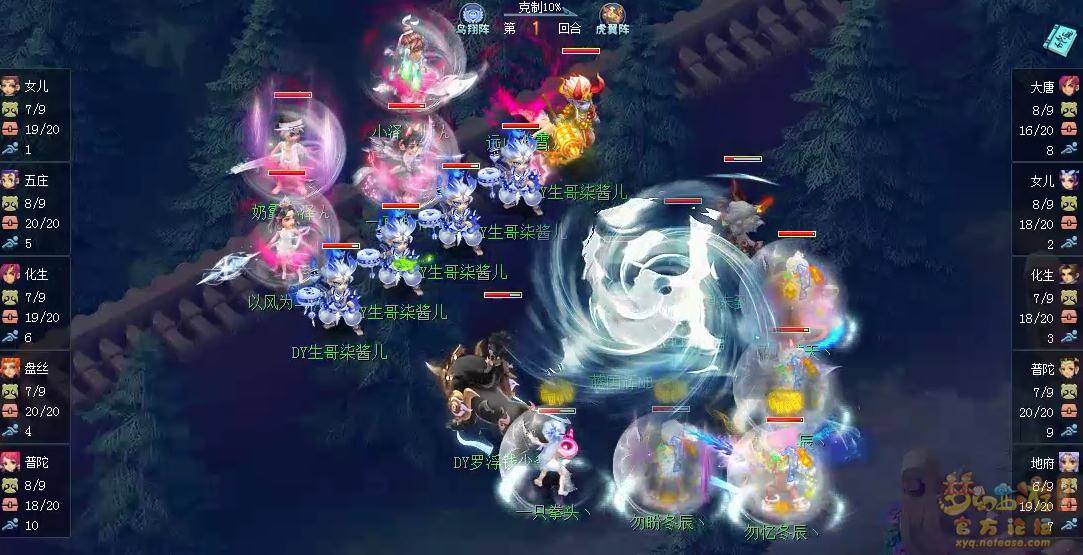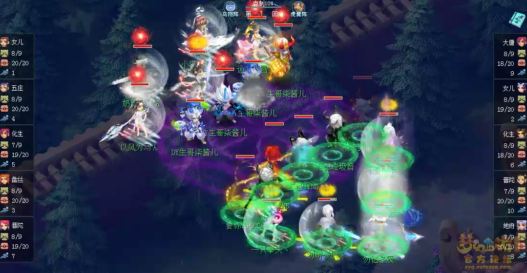 观战方【西栅老街】:女儿村、化生寺、阴曹地府、大唐官府、神木林,国标阵容。