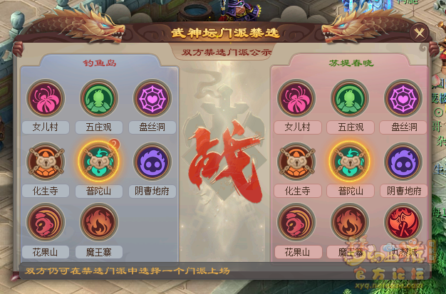 在本届武神坛中,钓鱼岛、苏堤春晓均选择禁用对手化生、普陀。根据禁选规则,双方可以选择一个门派复活。不过,从钓鱼岛的禁选策略来看,他们并不想让苏堤春晓上之前表现出色的力普陀三攻阵容。