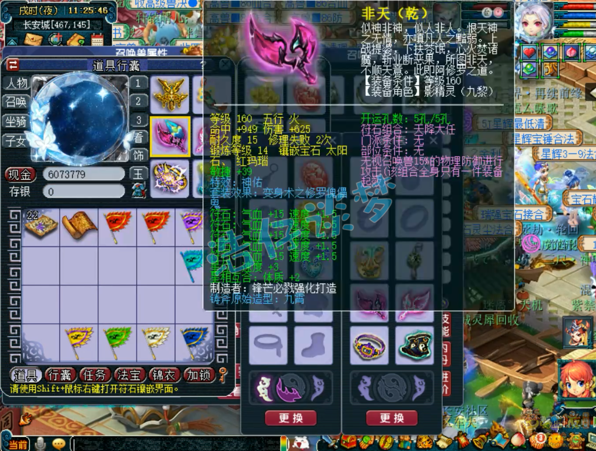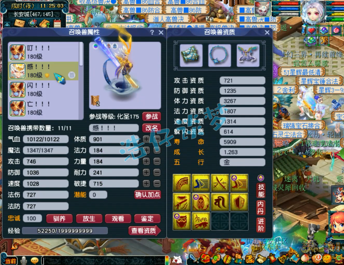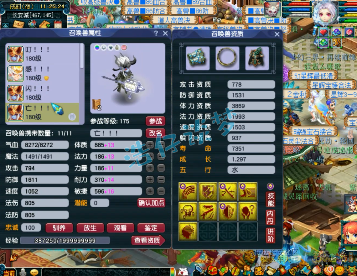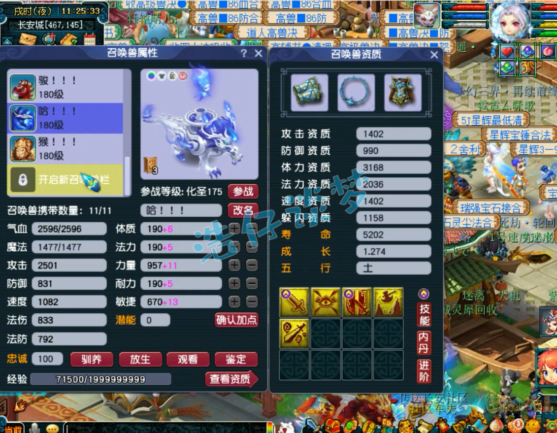 9技能死亡法防千速血宠童子,同样是一只4赐福的宝宝,套装带的是高神。