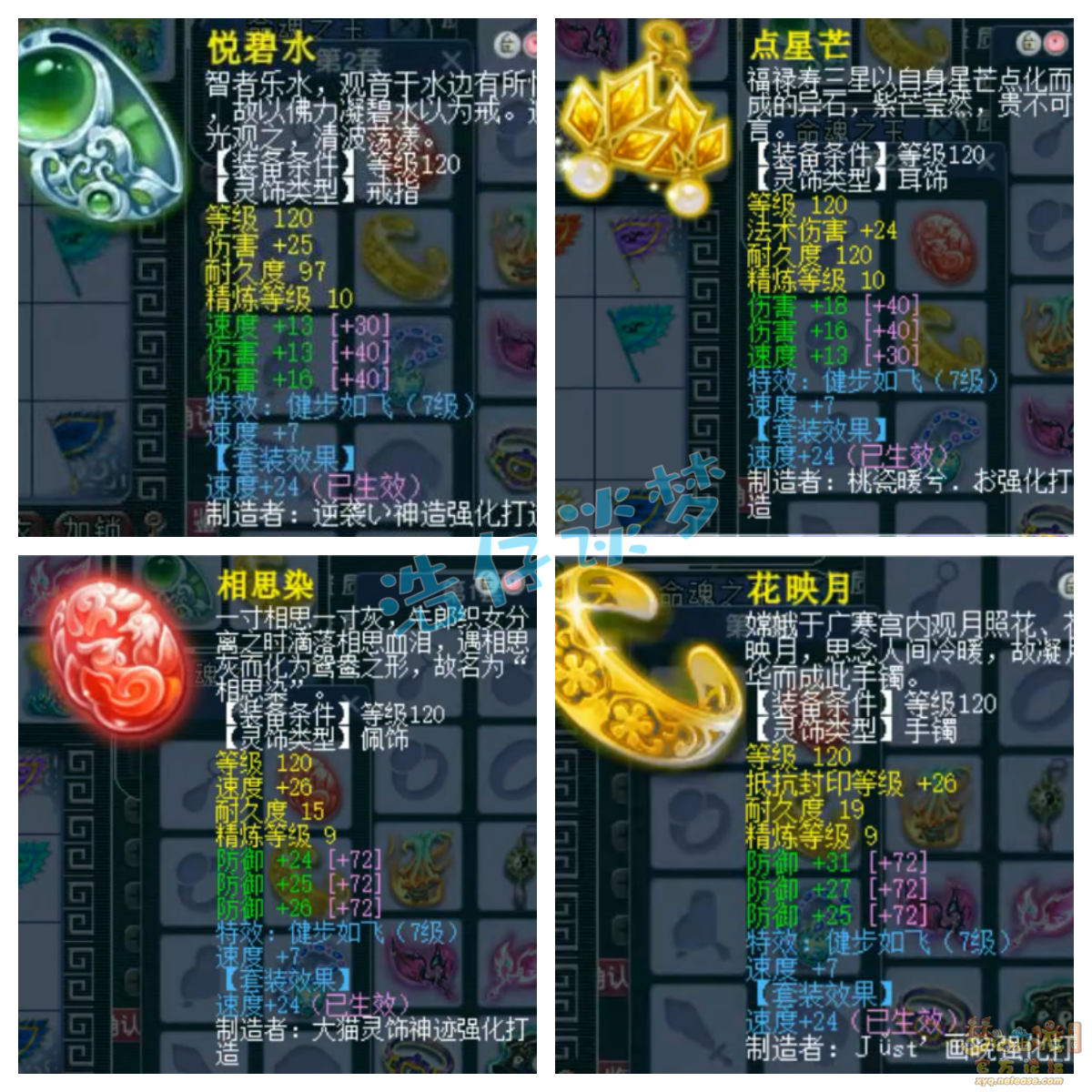 戒指和耳饰下排都是双伤害一速度,配饰和手镯下排都是三防御,特效都是7级健步如飞。