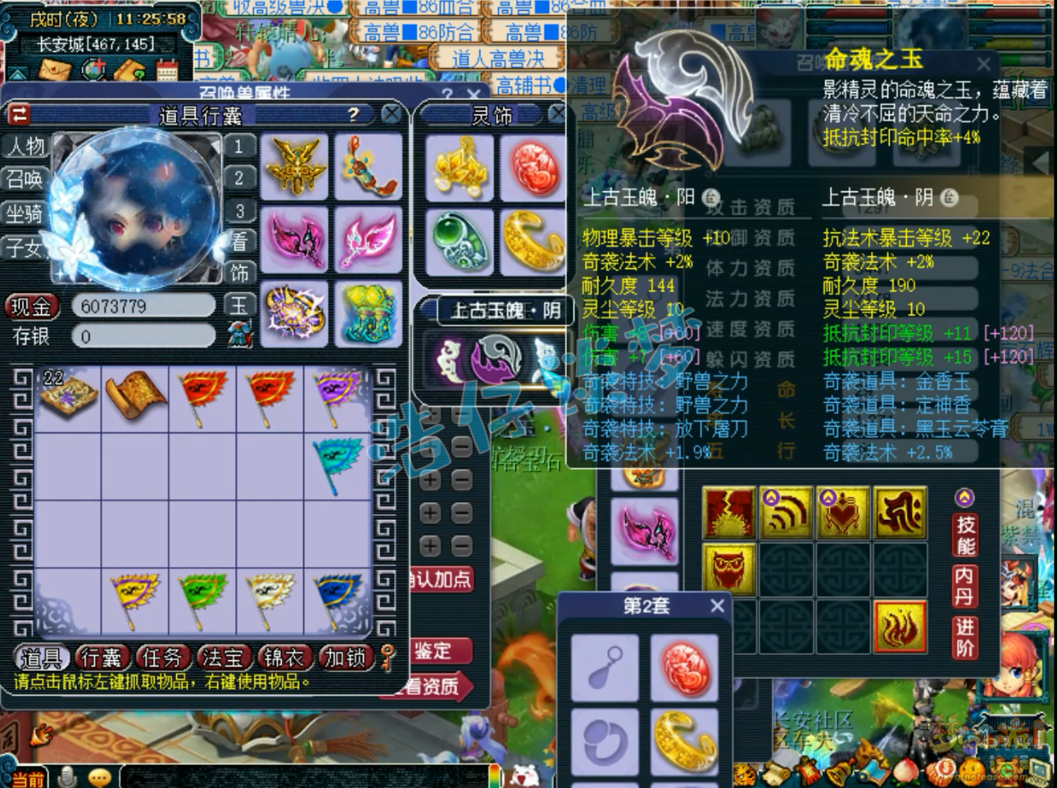 命魂之玉前排选择了双伤害,后排选择了双抗封,全部附加了奇袭法术,打了10锻五色灵尘。