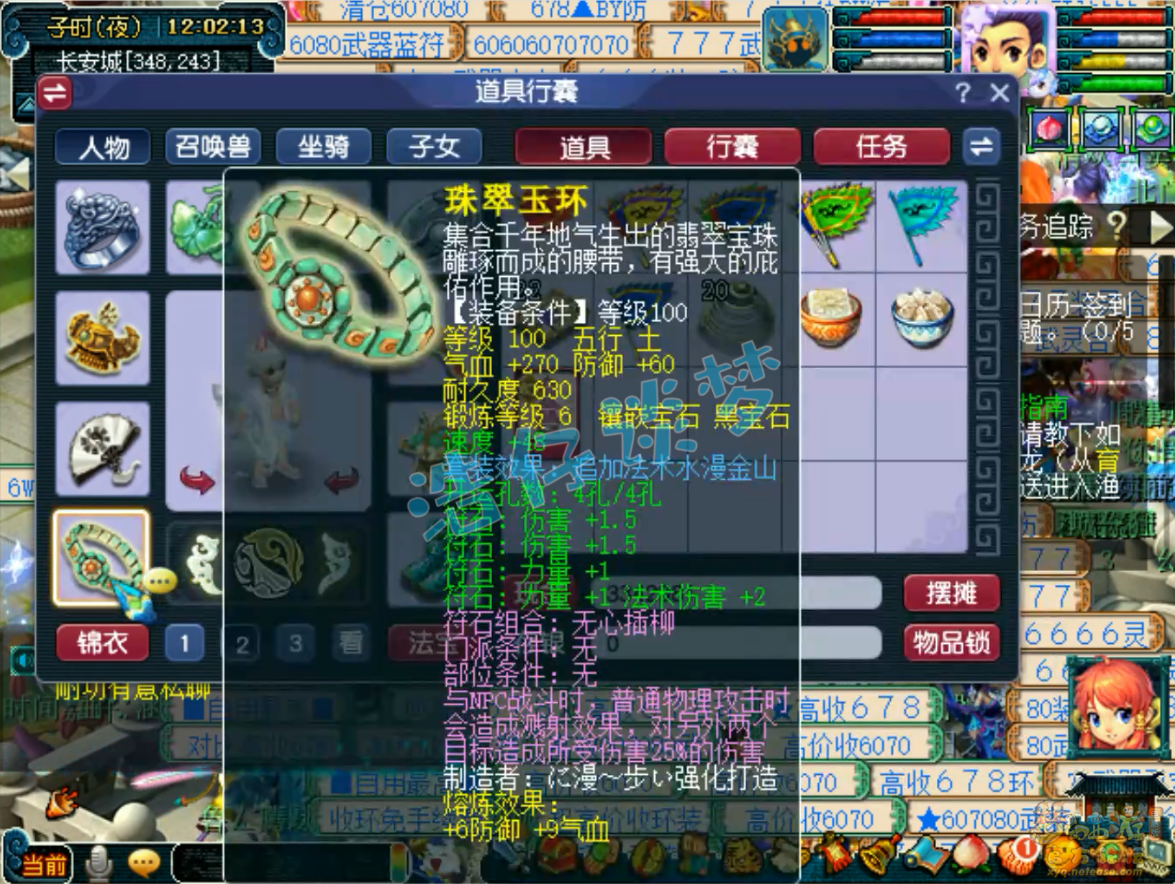戒指和耳饰下排都是双伤害一法伤,配饰下排双气血一法防,手镯下排双气血一防御,特效都是5级金石之坚。